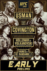 UFC 245: Usman vs. Covington was a mixed martial arts event produced by the Ultimate Fighting Championship that took place on December 14, 2019 at T-Mobile Arena in Paradise, Nevada. A UFC Welterweight Championship bout between the current champion and The Ultimate Fighter: American Top Team vs. Blackzilians winner Kamaru Usman and former interim champion Colby Covington served as the event headliner. A UFC Featherweight Championship bout between the current champion Max Holloway and Alexander Volkanovski took place as the co-main event.